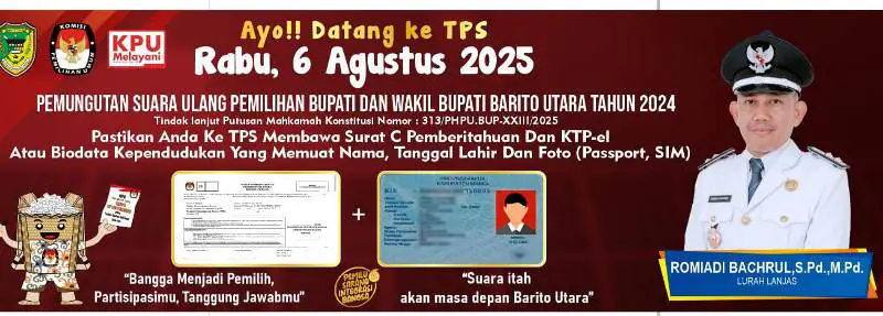 MUARA TEWEH, Kaltenghits.com – Menyambut Pemungutan Suara Ulang (PSU) Pemilihan Bupati dan Wakil Bupati Barito Utara Tahun 2024, Lurah Lanjas, Romiadi Bachrul, S.Pd., M.Pd., mengimbau seluruh warga Kelurahan Lanjas untuk datang ke Tempat Pemungutan Suara (TPS) dan menggunakan hak pilihnya pada hari Rabu, 6 Agustus 2025.