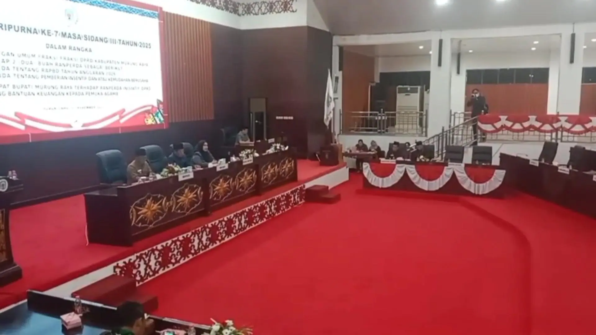 Rapat paripurna dipimpin oleh Ketua DPRD Murung Raya, Rumiadi, didampingi Wakil Ketua I, Dina Maulidah, serta dihadiri oleh Bupati Murung Raya, Heriyus Suhaili, unsur Forkopimda, dan sejumlah tokoh masyarakat.
